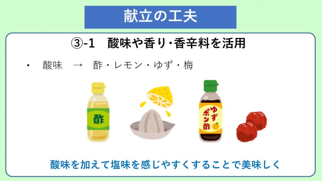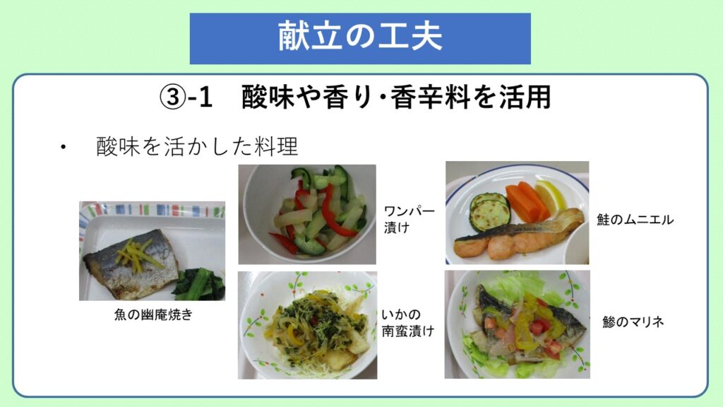 当センターでは決められた量の塩分を有効に使用するために、献立作成の際に「酸味」を上手く利用して塩味を感じやすくすることで美味しい料理を取り入れて提供しています。